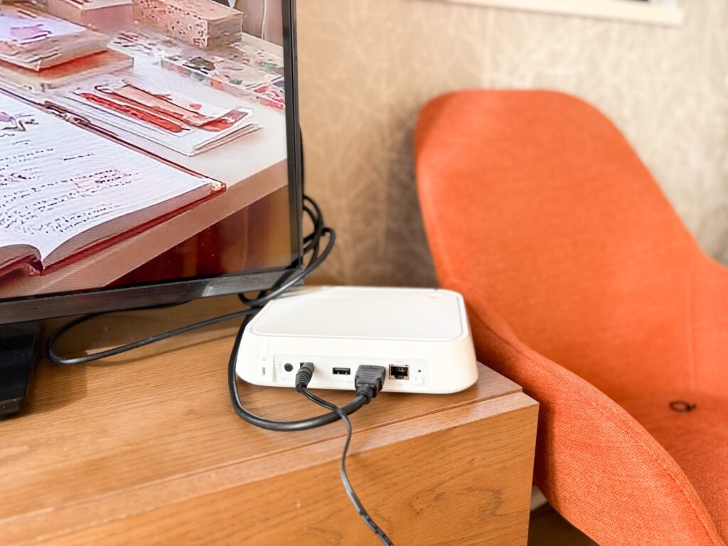「おもいでばこ」の取り付けはとても簡単!HDMIケーブルで本体とテレビを、ACアダプターで本体とコンセントを接続して電源を入れるだけでOKです。