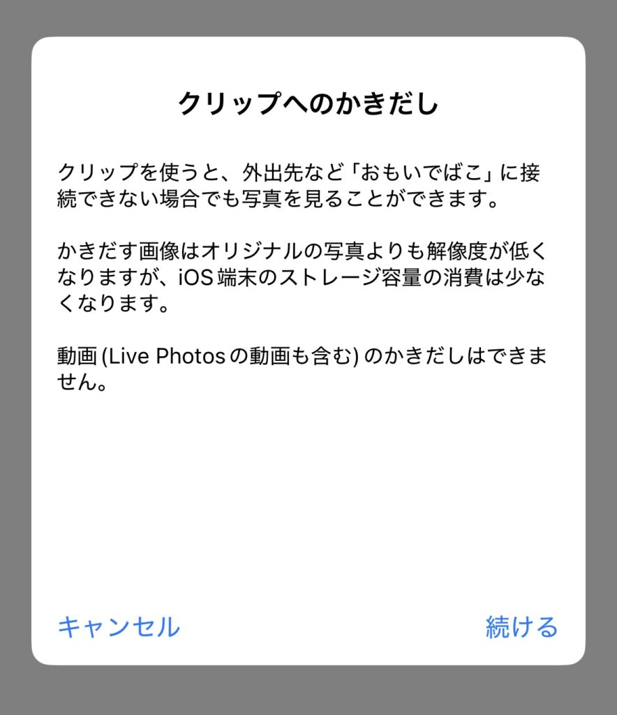また、基本的にスマートフォンのアプリ上でデータの閲覧ができるのは「おもいでばこ」本体と接続しているときだけですが、アプリのクリップ機能を活用することで外出先でも写真や動画を楽しむことができます。お気に入りのデータはクリップしておくと、いつでもどこでも見ることができて便利です。
